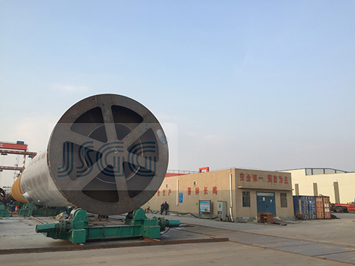 這是巨鑫鋼管承接的魯能集團江蘇東臺200MW海上風電單樁項目,該單樁規(guī)格為φ(5500~5900)×(50~70)×62000mm,材質為DH36-Z25、DH36、Q345C。其特點為:該鋼管樁由五種不同的厚度,三種不同材質組成,樁頂段9米為φ5500×60mm直管與法蘭的焊接件,中間段9米為φ(5500~5900)×60mm 變徑管,樁底段44米為 φ5900×(50~70)mm 直管,焊接工作量非常大。另外,鋼管樁樁頂部位內、外表面需要防腐,防腐總長度24米。其中,鋼管樁外防腐涂層厚度A區(qū)16米為1060μm,B區(qū)8米為600μm;鋼管樁內防腐涂層厚度為400μm。由于防腐涂層厚度較大,加之天氣溫度較低,防腐固化時間較長,防腐工作量非常大。