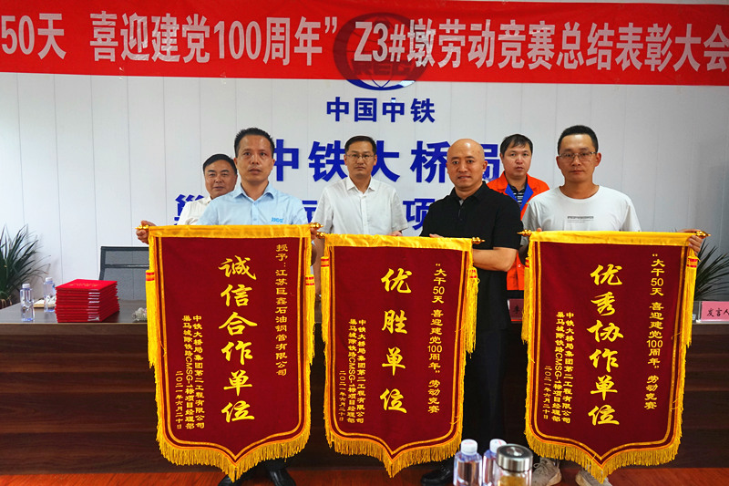 6月20日,在中鐵大橋局集團(tuán)巢馬城際鐵路項(xiàng)目部,江蘇巨鑫鋼管公司銷售副總徐阿三和項(xiàng)目部經(jīng)理劉松,接受了由中鐵大橋局集團(tuán)第二工程有限公司巢馬城際鐵路CMSG-1標(biāo)項(xiàng)目經(jīng)理部授予的“誠(chéng)信合作單位”錦旗。