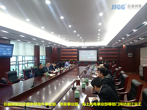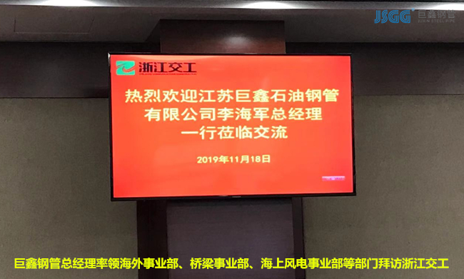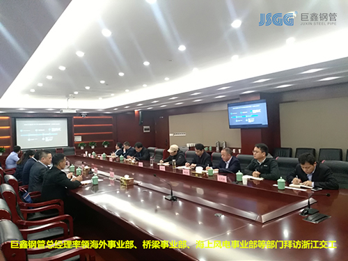 為了感謝浙江交工長期以來對(duì)巨鑫鋼管的幫助和支持,同時(shí)也為能進(jìn)一步提高巨鑫鋼管的服務(wù)質(zhì)量。2019年11月18日,巨鑫鋼管總經(jīng)理李海軍率橋梁碼頭事業(yè)部、高鐵地鐵事業(yè)部、海上風(fēng)電事業(yè)部、城市管網(wǎng)事業(yè)部、海外事業(yè)部五大部門經(jīng)理集體拜訪了浙江交工集團(tuán)。
